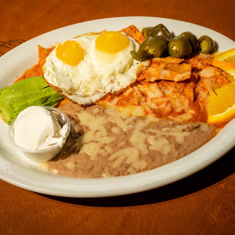 Tortilla strips cooked in a spiced red or green sauce topped with cheese, onions & jalapeños. Served with rice, beans, and tortillas. $12.95 | With Eggs $13.95